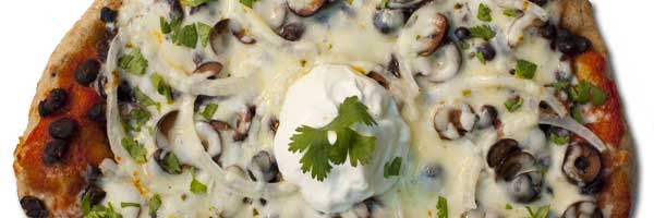 Enchilada Sauce, Black Beans, Whole Milk Mozzarella, Topped with Sour Cream, Avocado, and Lime Dressed White Onions and Cilantro