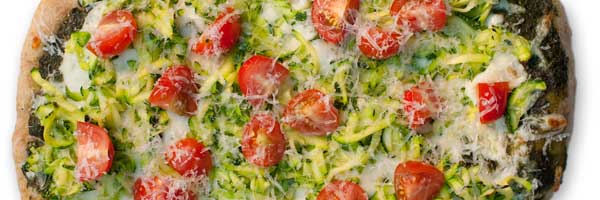 Basil Pesto, Shredded Zuchini, Whole Milk Mozzarella, Fresh Sun Gold Cherry Tomatoes, Aged Balsamic Drizzle